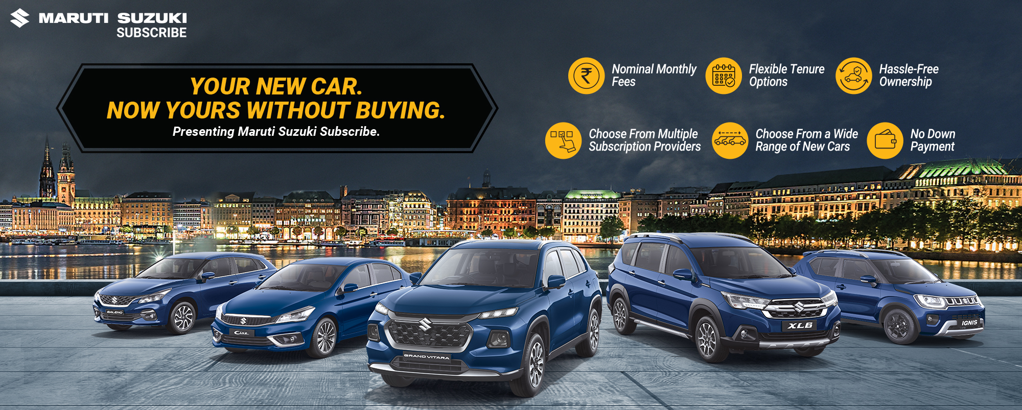 Maruti Suzuki Subscribe enables all customers to enjoy driving their preferred Maruti Suzuki cars without having to deal with all the financial responsibilities that come with owning a car.All you need to do is opt for a monthly subscription plan at a fixed monthly fee, which includes the routine maintenance and insurance costs, and choose a flexible tenure. At KP AUTOMOTIVE in, Queens Road Jaipur, Jaipur, all Hatchback, Sedan, SUV, the MUV models line-up includes Baleno, Invicto, EVitara, Jimny, Ciaz, Ignis, Fronx, Grand Vitara, XL6. Here, you will enjoy Maruti Suzuki Subscribe benefits such as: